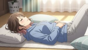 仰向けに寝て、お腹に手を当てながら5秒吸って、5秒吐く呼吸を繰り返します。