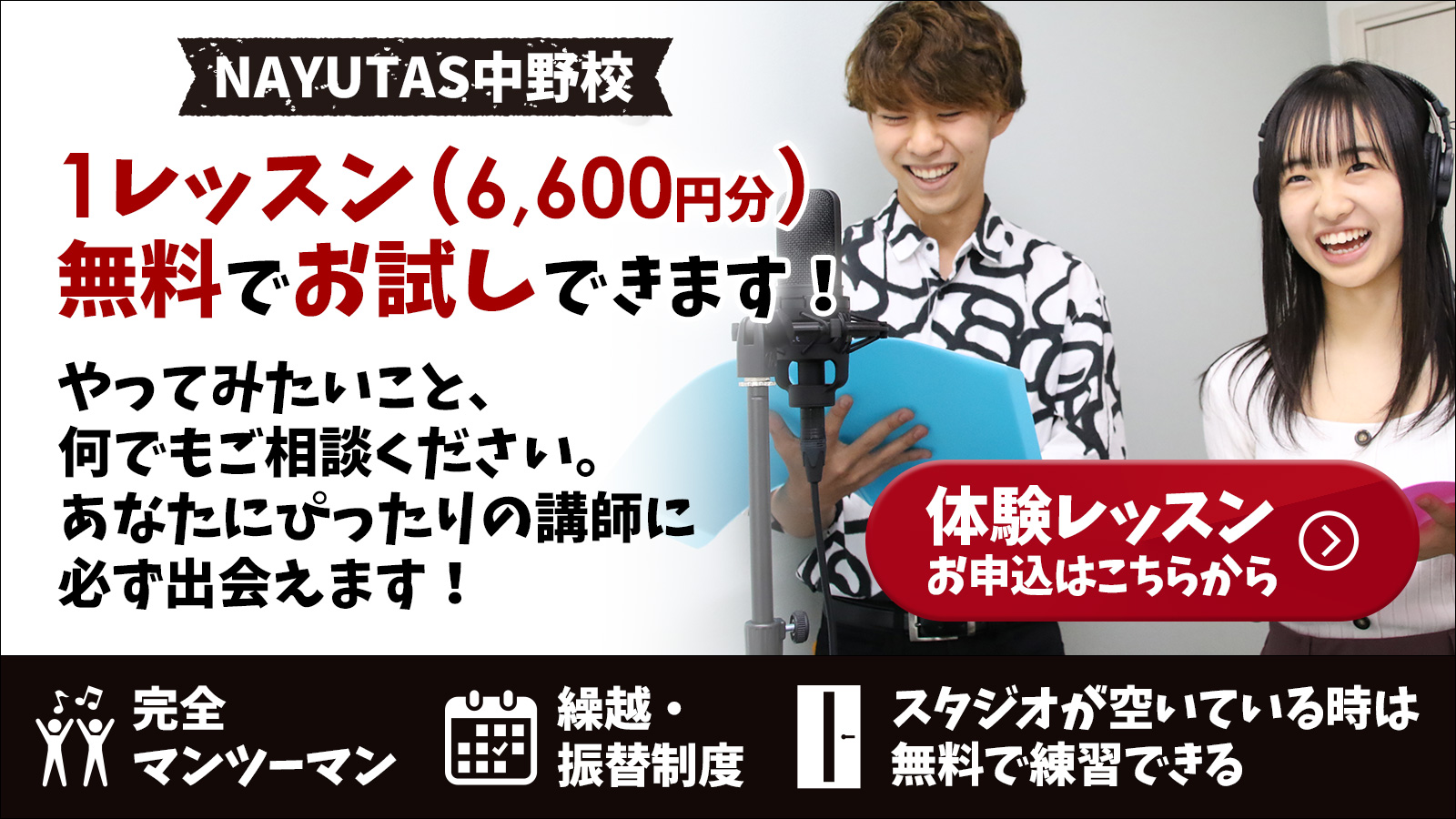 NAYUTAS(ナユタス)中野校では、プロの講師がマンツーマンで指導し、通る声が出せるようになるまで丁寧にサポートします!