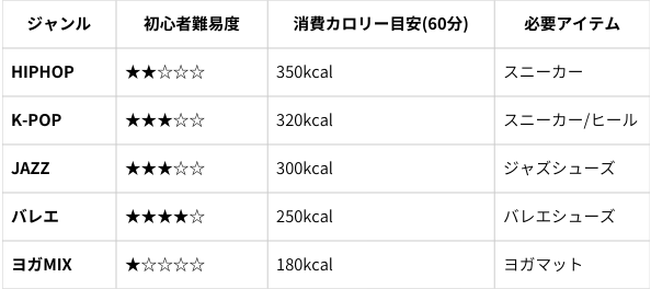 ダンスと言ってもジャンルによって動きや音楽、必要な体力が大きく異なります。ここでは代表的な5ジャンルを取り上げ、初心者の取り組みやすさ、消費カロリー、必要アイテムなどを一覧表で整理しました。