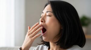 - 鏡を見ながら、大きなあくびをします。